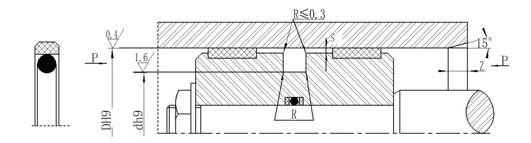 পিস্টন (বোর) এর জন্য বর্গাকার কম্বিনেশন সিল (গ্লাইড রিং সীল) একটি PTFE-ভরা আয়তক্ষেত্রাকার সিলিং রিং এবং একটি ও-রিং নিয়ে গঠিত। এটি হাইড্রোলিক গতির আদান-প্রদানে দ্বিমুখী চাপ সিলিংয়ের জন্য উপযুক্ত। ও-রিং রেডিয়াল বল প্রদান করে এবং সীল রিং পরিধানের জন্য ক্ষতিপূরণ দেয়। এটি সাধারণত একটি গাইড রিং সঙ্গে একযোগে ব্যবহৃত হয়. 30 মিমি থেকে কম সিলিন্ডার ব্যাসের জন্য, একটি বিভক্ত (খোলা) খাঁজ নকশা ব্যবহার করা উচিত।